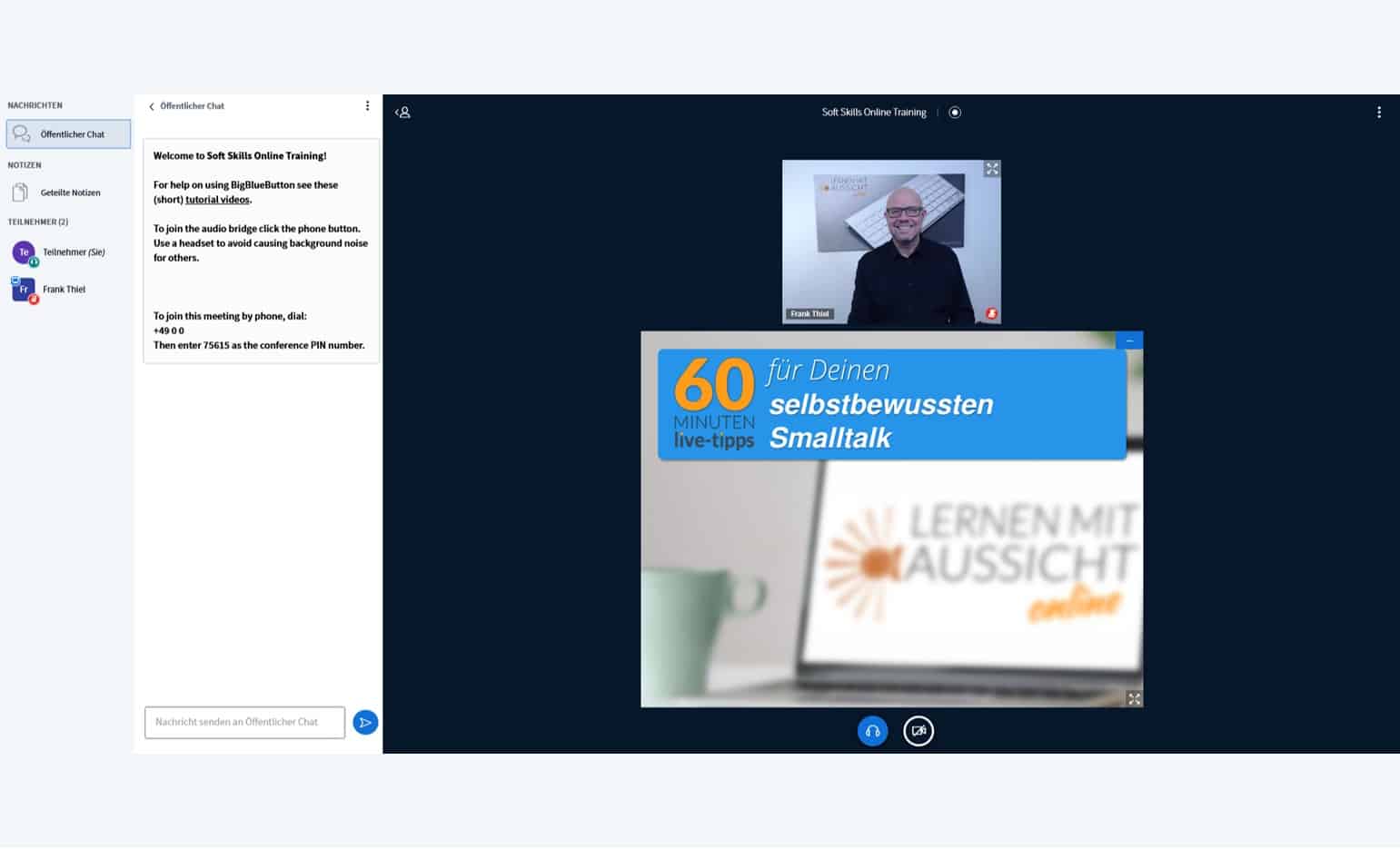 Weitere InformationenDie Soft Skills Online Trainings werden von uns „live“ mittels des browserbasierten Videokonferenz-Tools (BigBlueButton/Open Source) an einem mit Ihnen vereinbarten Datum vermittelt.